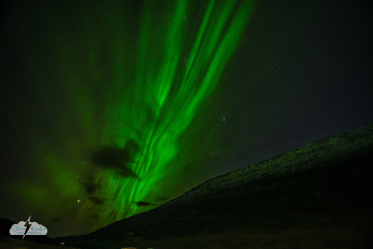 My No. 1 sub-item for this bucket-list trip was seeing the Northern Lights. I’ve seen them before from the U.S., during the May 10 and May 11, 2024, solar storm displays when Alethea and I took a detour from storm chasing to find them. While the pictures then showed a lot more colors than what I captured in Iceland, to the naked eye, they weren’t as vivid in terms of actual light. Up near the Arctic Circle — while the color was still somewhat faint — the features of the aurora were very much visible to the naked eye. The lights were almost like eerie self-illuminated clouds.