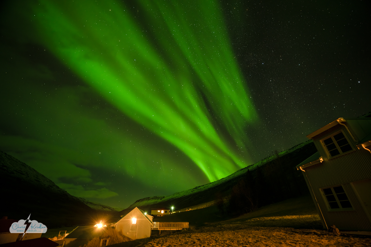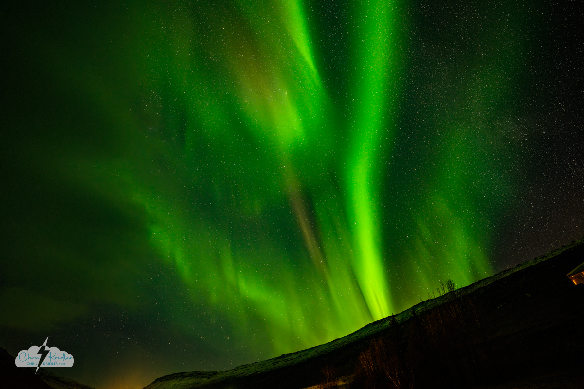 What’s amazing to me is that even if the parameters aren’t particularly promising, this far north, a big show can happen anyway. And that’s what we got on November 15 (into the wee hours of November 16) at Wildnerness Center, a remote hotel set on an old farm in east-central Iceland. Framed by a river valley, the display was vivid and came in (at least) three waves. I only gave up because I was freezing and I wanted to go home with all my fingers. (Not really a joke – I think I was a bit frost-nipped.)